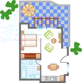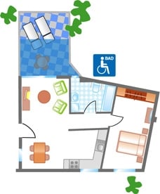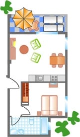 Mit Appartement “PEDRO I-A18” erwartet Sie eine gemütlich eingerichtete Ferienwohnung mit Schlafzimmer, Bad mit Dusche, Wohn-Esszimmer mit gut ausgestatteter Küche.