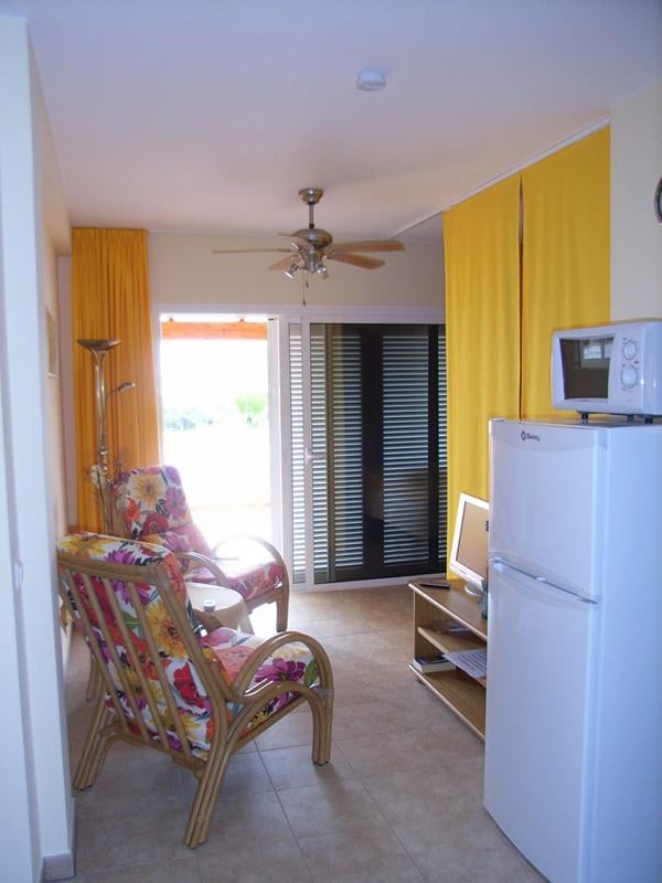 Wohn-Esszimmer, 1 Schlafzimmer, Bad mit Dusche, gut ausgestattete Küchenzeile. Eigene Terrasse mit Meerblick. Große Poolterrasse und