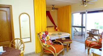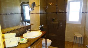 Wohn-Esszimmer-Schlafbereich, Bad mit Dusche, gut ausgestattete Küchenzeile. Eigene große Terrasse mit Meerblick. Große Poolterrasse und
