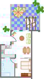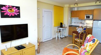 Wohn-Esszimmer, 1 Schlafzimmer, Bad mit Dusche, gut ausgestattete Küchenzeile. Balkon mit Meerblick. Zusätzlich eigene große Sonnenterrasse, die Sie vom Balkon aus direkt begehen.